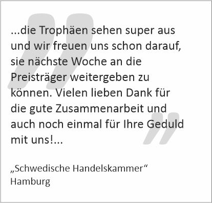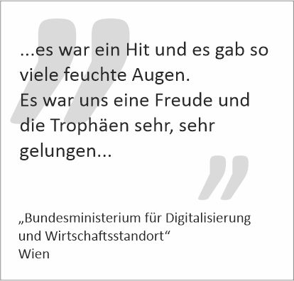 gehört den individuellen Sonderanfertigungen: Wir setzen Ihre Ideen und Wünsche um und gestalten Ihren eigenen Award, ob einmalig passsend zu Ihrem Event, oder jedes Jahr wiederkehrend, als eigener "Brand-Award", mit Wiedererkennungswert. Einzigartig, nach Kundenvorgabe maßgeschneidert und trotzdem günstiger, als man denkt - fragen Sie uns gerne an!