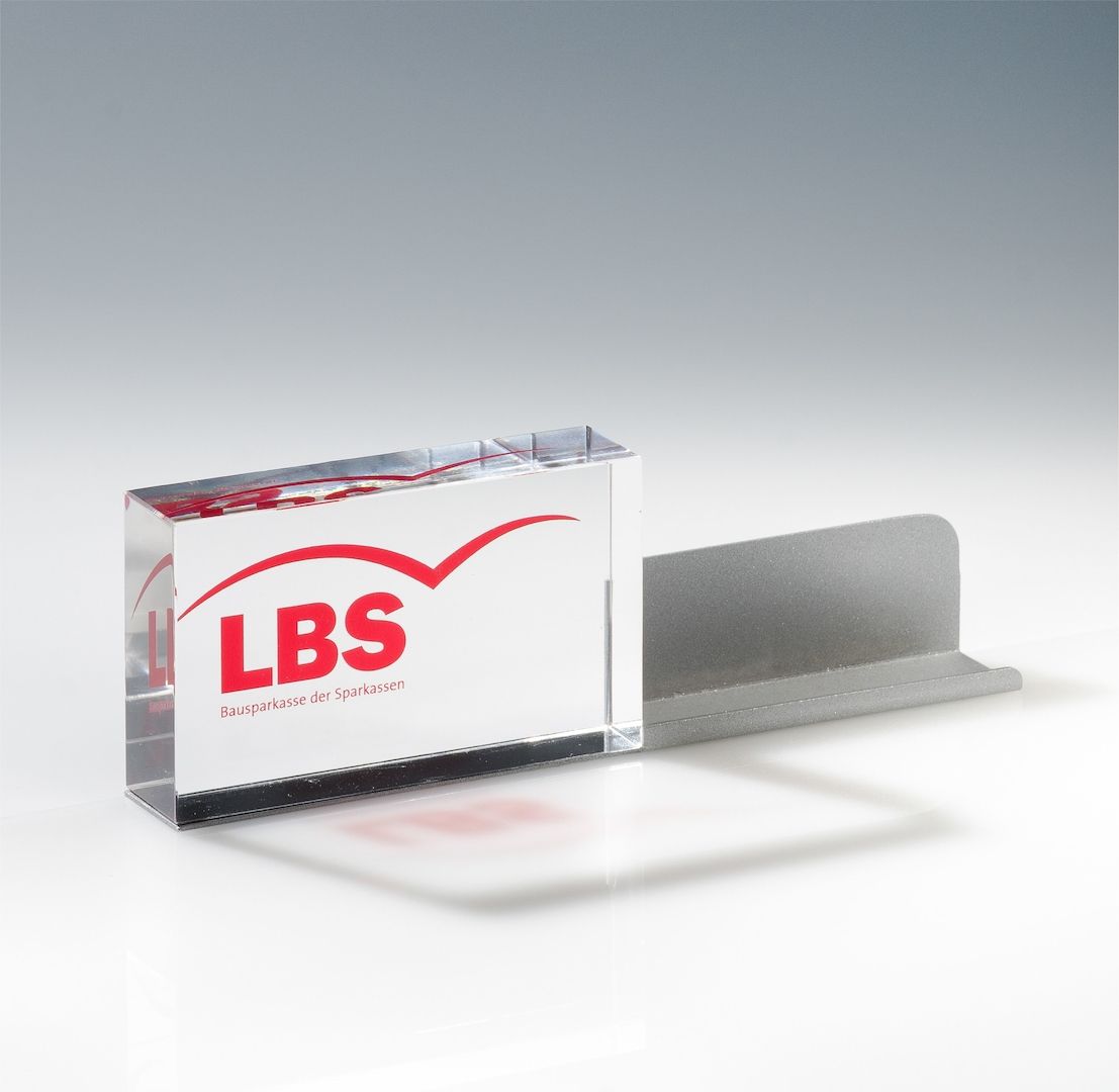 Der 100 x 60 x 25mm große Acrylglasblock ist partiell mit dem Firmenlogo bedruckt und auf einer Aluminiumschiene aufgeklebt. Diese Bodenplatte erweitert sich seitlich zu einem abgekanteten, pulverbeschichteten Aluminiumprofil, in welches eine vertikale Visitenkarteform passgenau eingelgt werden kann.