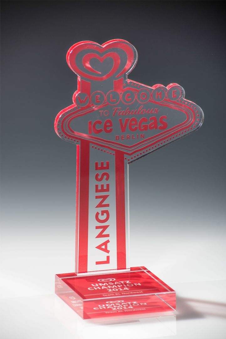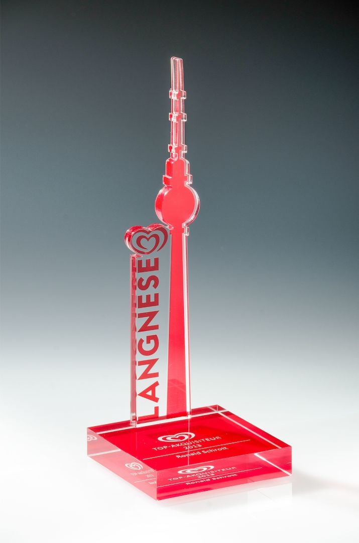 Eine Trophäe die für Top-Aquisition vergeben wurde. Das Oberteil der Awards aus 2013 ist dem "Berliner Fernsehturm" nachempfunden, an dessen Längseite das Firmenlogo dargestellt wird. Der Sockel bietet genügend Platz für Logo, Titel, Jahreszahl und Preisträger - die Vorgaben wurden auf die Unterseite gedruckt, so dass eine bessere Tiefenwirkung erzielt wird.