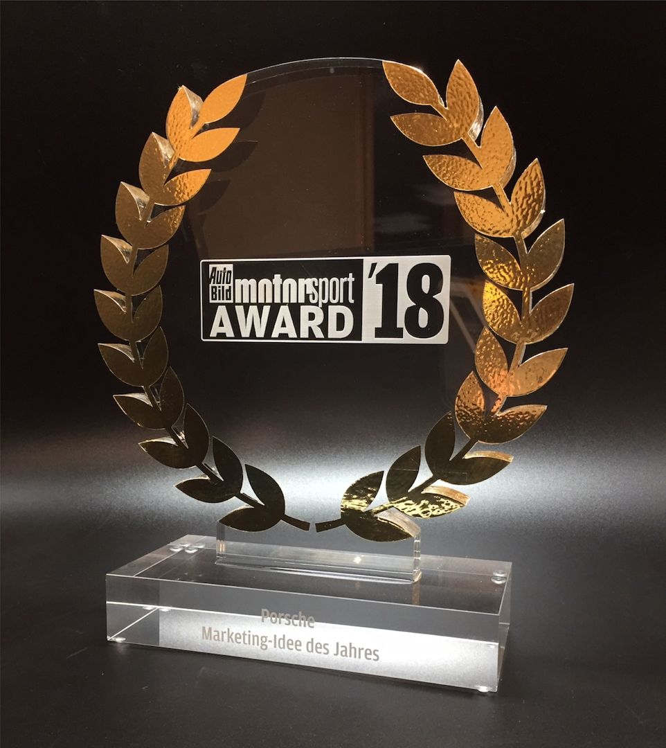 Diese knapp 30cm hohe und 25cm breite Motorsporttrophäe fällt auf der Bühne garantiert auf - zumal der konturgeschnittene Kranz mit echtem Blattgold versehen wurde. Passend dazu wurde eine schlichte Lasergravur gewählt. Der Award wurde in sechs verschiedenen Kategorien vergeben.