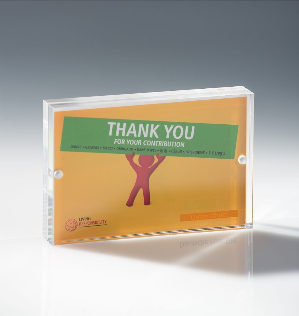 Zwei 12mm starke Acrylplatten werden durch einen Magnetverschluß zusammen gehalten. Das Innenleben ist beliebig gestalt/- und auswechselbar: Fotos, Urkunden, aber auch Lasergravur oder farbiger Digitaldruck sind möglich.