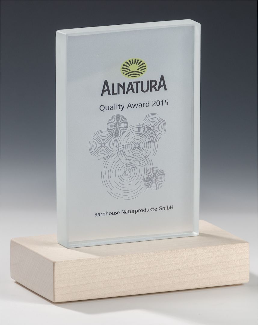 Diese Auszeichnung sollte einen möglichst nachhaltigen Charakter haben, weswegen hierfür schon mal kein Acrylglas verwendet wurde. Das satinierte Oberteil ist mit einem beidseitigen Farbdruck versehen, was eine schöne Tiefenwirkung erzielt und steht auf einem Sockel, welcher aus heimischer, zertifizierter Holzwirschtschaft bezogen wurde.