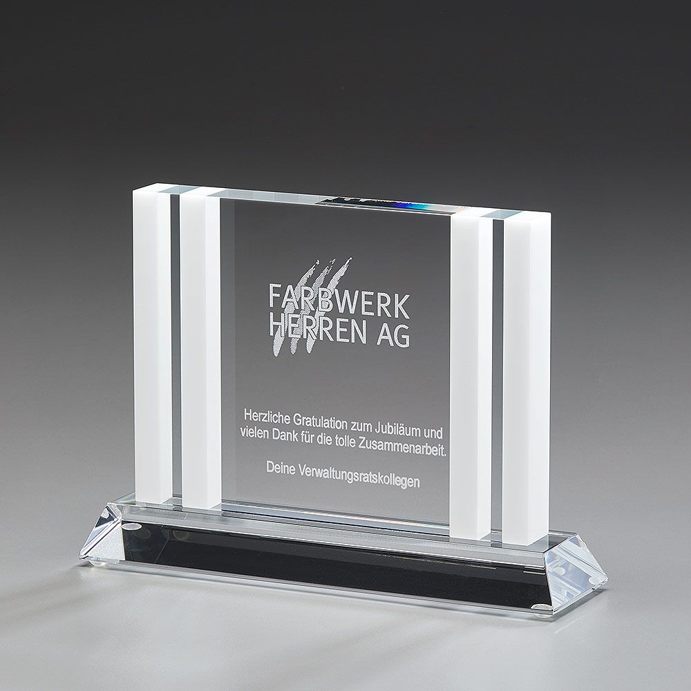Ein klar strukturierter Award, der optisch wahrgenommen wird und bei welchem sich eine Lasergravur unbedingt empfiehlt, da diese und das weißes Glasdesign sich wunderbar ergänzen.