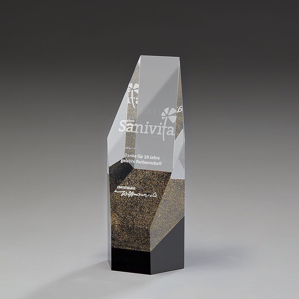 Ein Glasaward in der Form eines Hexagons, mit einem transparenten Oberteil, einer glänzenden goldfarbenen Einlage und einem schwarzen Kristallglassockel.