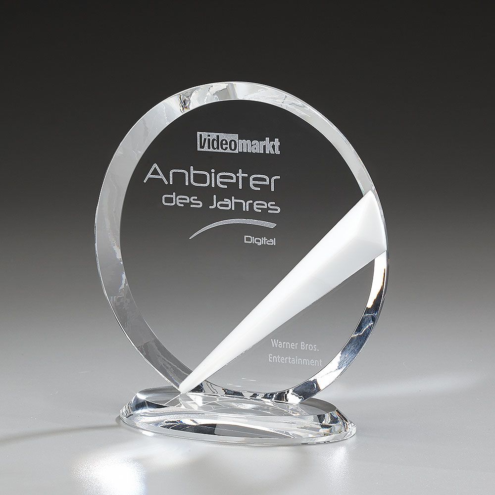 Eine kreisrunde Auszeichnung mit schönem Kantenschliff und einer weißen 3D-Glas-Applikation, die auf die Oberfläche aufgeklebt wird. Noch harmonischer wird der Award durch die ovale Form des Glassockels.