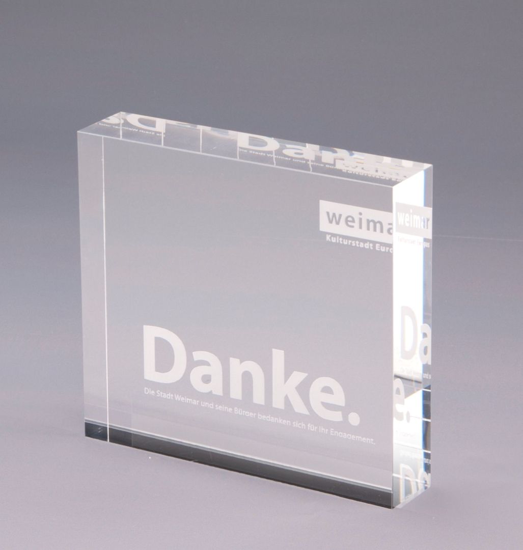 Diese Auszeichnung punktet durch "Weniger ist Mehr". Mit einer Acrylglasstärke von 2,5cm kann der Aufsteller ohne Sockel stehen, durch die nur partiell aufgebrachte, rückseitige Lasergravur wird eine schöne Tiefenwirkung erzielt.