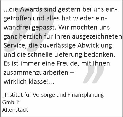 Bei Uwe Frank Awards legen wir größten Wert auf die Privatsphäre und den Datenschutz unserer geschätzten Kunden. Als renommierter Hersteller von hochwertigen Awards, verstehen wir, dass viele unserer Kunden, darunter namhafte Global Player, besondere Anforderungen an die Vertraulichkeit haben. Dies respektieren wir selbstverständlich und präsentieren daher hier nur Produktbeispiele, die wir mit Erlaubnis unserer Kunden veröffentlichen dürfen! Diese Bilder bieten einen kleinen, aber aussagekräftigen Einblick in unser umfangreiches Produktsortiment und sagen mehr als 1000 Worte: Sie sind unsere größte Belohnung, machen uns stolz und zufrieden, sind aber auch stetiger Ansporn, denn