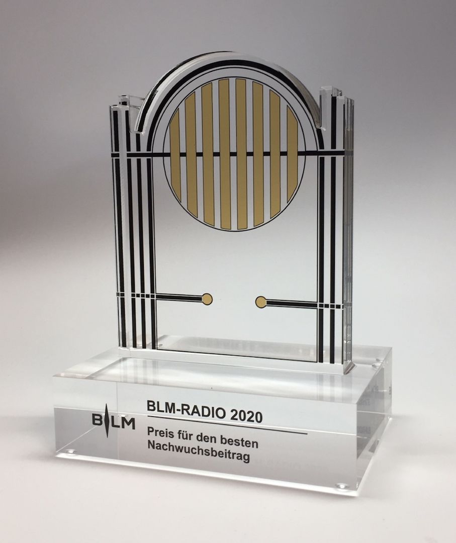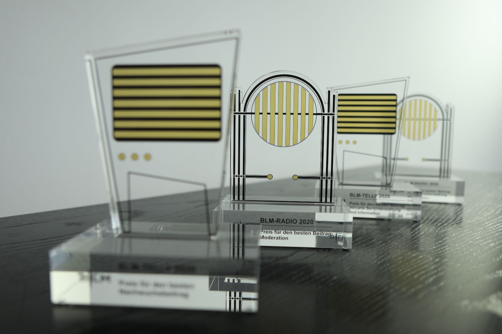 Superschönes Design auf 4cm hohem Sockel - die BLM-Radio/- und BLM-Telly Awards werden für 9 verschiedene Kategorien vergeben.
