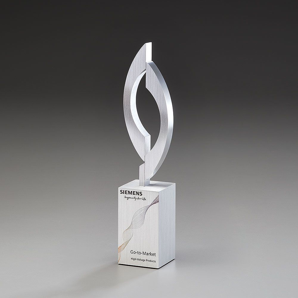 Eine wunderschöne Metalltrophäe, mit dynamischer Formsprache: Zwei fein geschliffenen Alluminiumflügeln stehen auf einem massivem, 80mm hohem Metallsockel, auf welchem der farbige Digitaldruck ganz besonders gut wirkt.