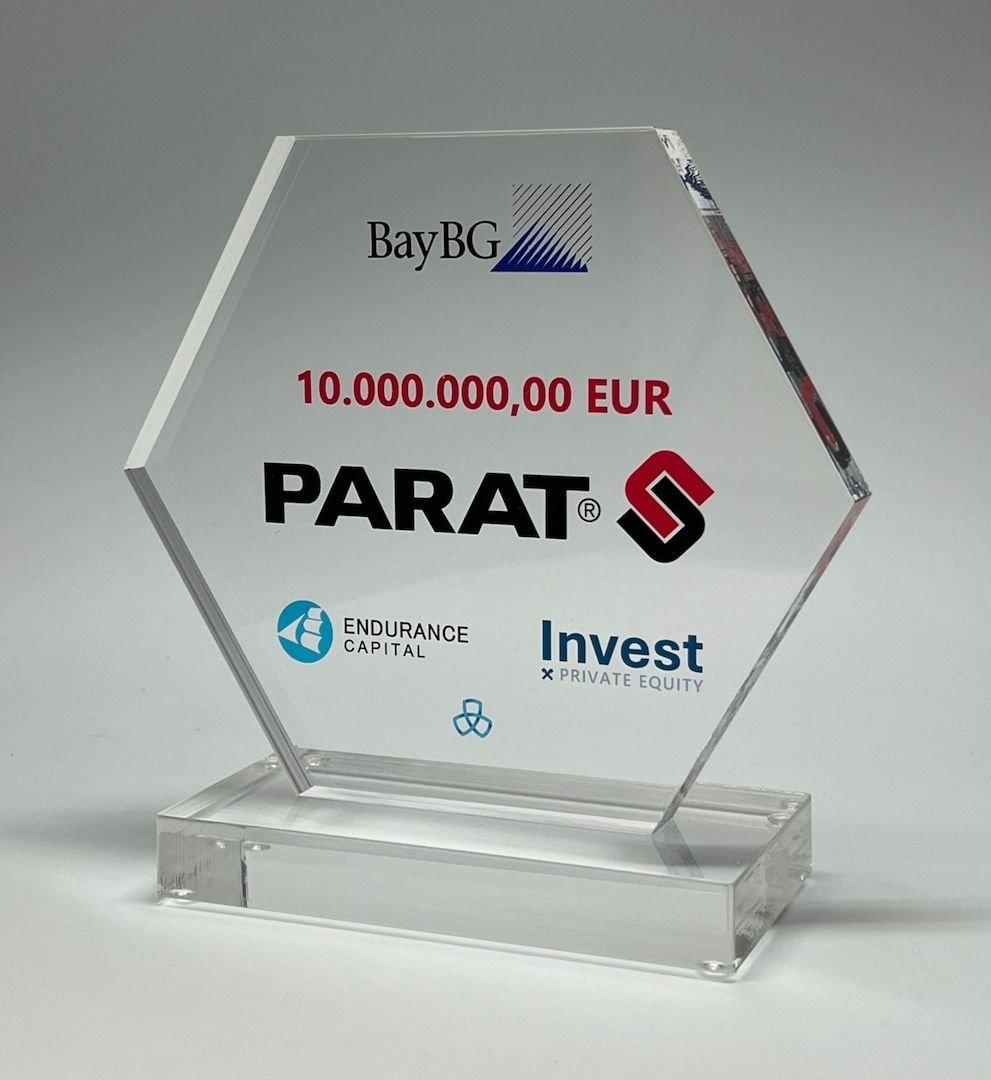 Unser Kunde hatte eigentlich einen Award aus unserem Standardsortiment ausgewählt, hat sich aber dann begeistert für unsere Nachhaltigkeits-Awards entschieden. Hier wurde der Artikel "ECO 25" mit Hexagonform () ausgewählt und einseitig bedruckt. Bei dem Foto fehlt noch Text, der später mit "Weißhinterdruckung" ergänzt wurde.