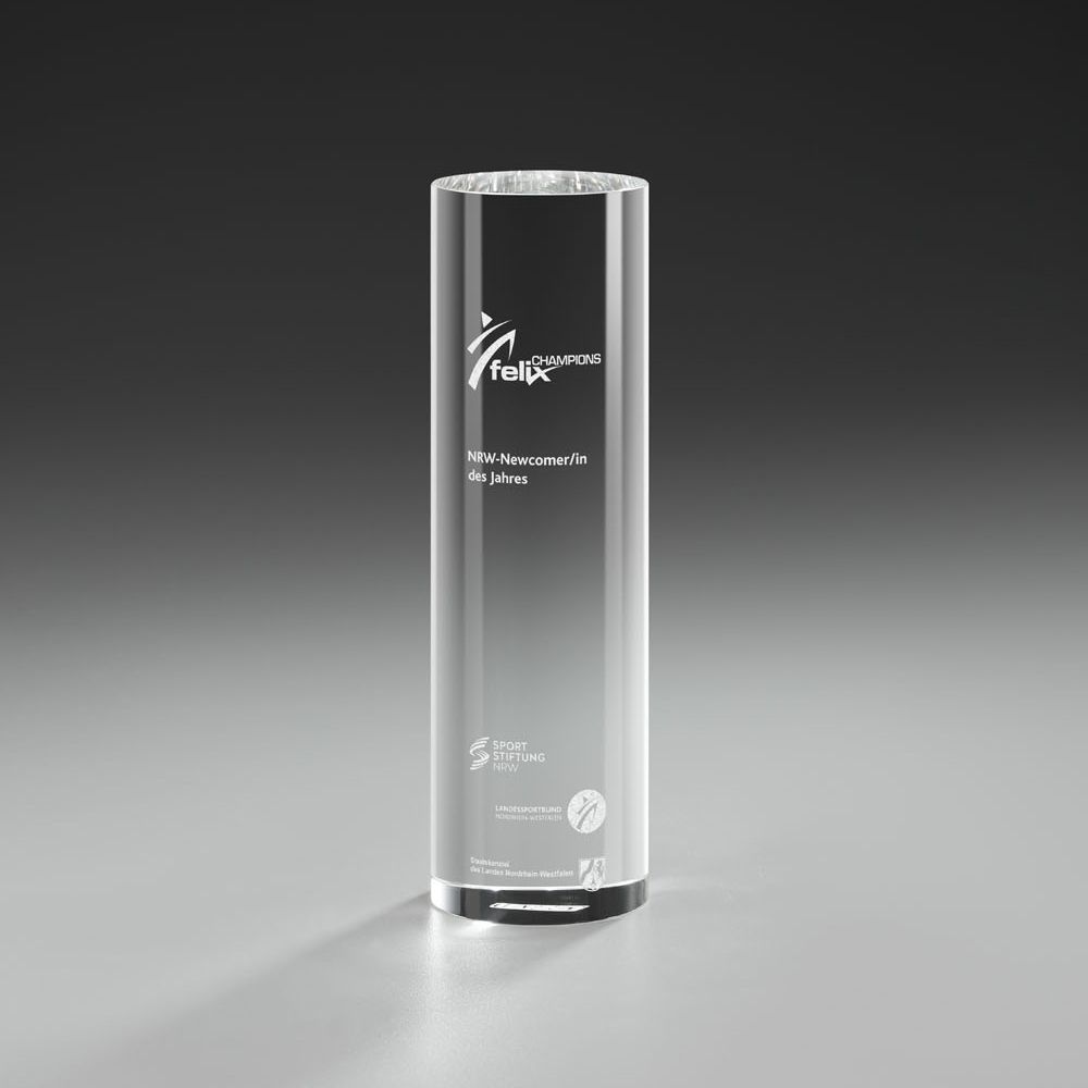 Anspruchsvolle, 70mm starke, kristallklare Glassäule, die Eleganz und Formschönheit einfach auf den Punkt bringt; eine Personalisierung erfolgt hier per Lasergravur (Farbdruck auf Anfrage).
