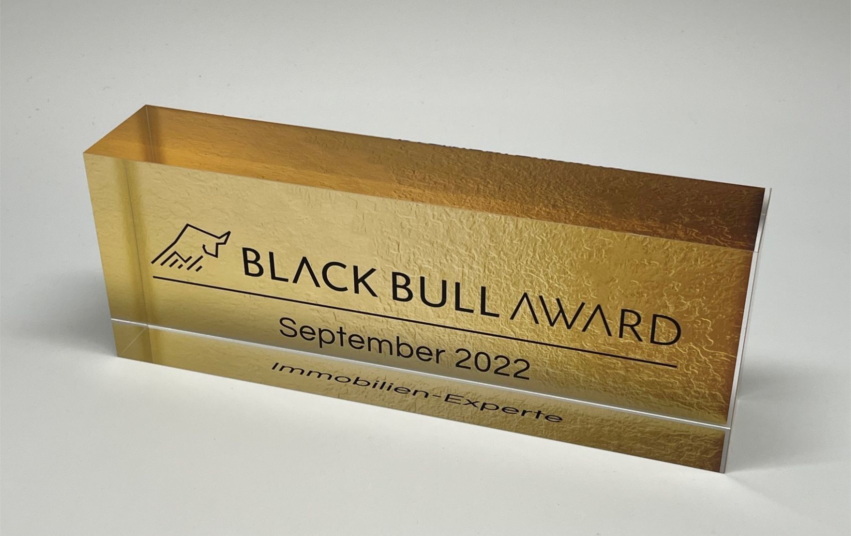 Der "Black Bull Financial-Tombstone" seit 2022 im Acrylglasblock/Tombstone-Format.