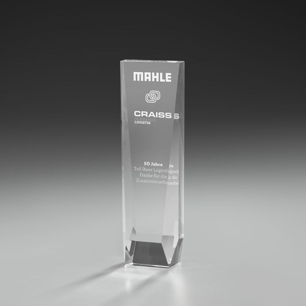 Ein massiver Kristallglas-Aufsteller mit einer Standfläche von 40mm, der sich nach oben hin auf 15mm verjüngt - mit aufwendig breitem Kantenschliff, welcher dem Tombstone bei all seinem Volumen auch Leichtigkeit verleiht.