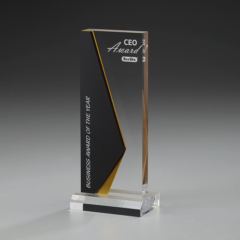 Ein sehr stilvoller, dreistufiger Award, mit einer glasklaren Stele, schwarzer Acryl-Auflage und goldfarbenem Digitaldruck - diese Trophäe hat Klasse.