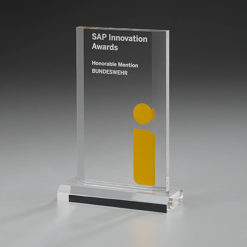 Noch ein Award-Aufsteller, ebenfalls mit schlichtem Design, aber viel Platz für Lasergravur und/oder Farbdruck. Ungewöhnlich ist die breite Längskantenfacette, die der rechteckigen Form etwas die Strenge nimmt.