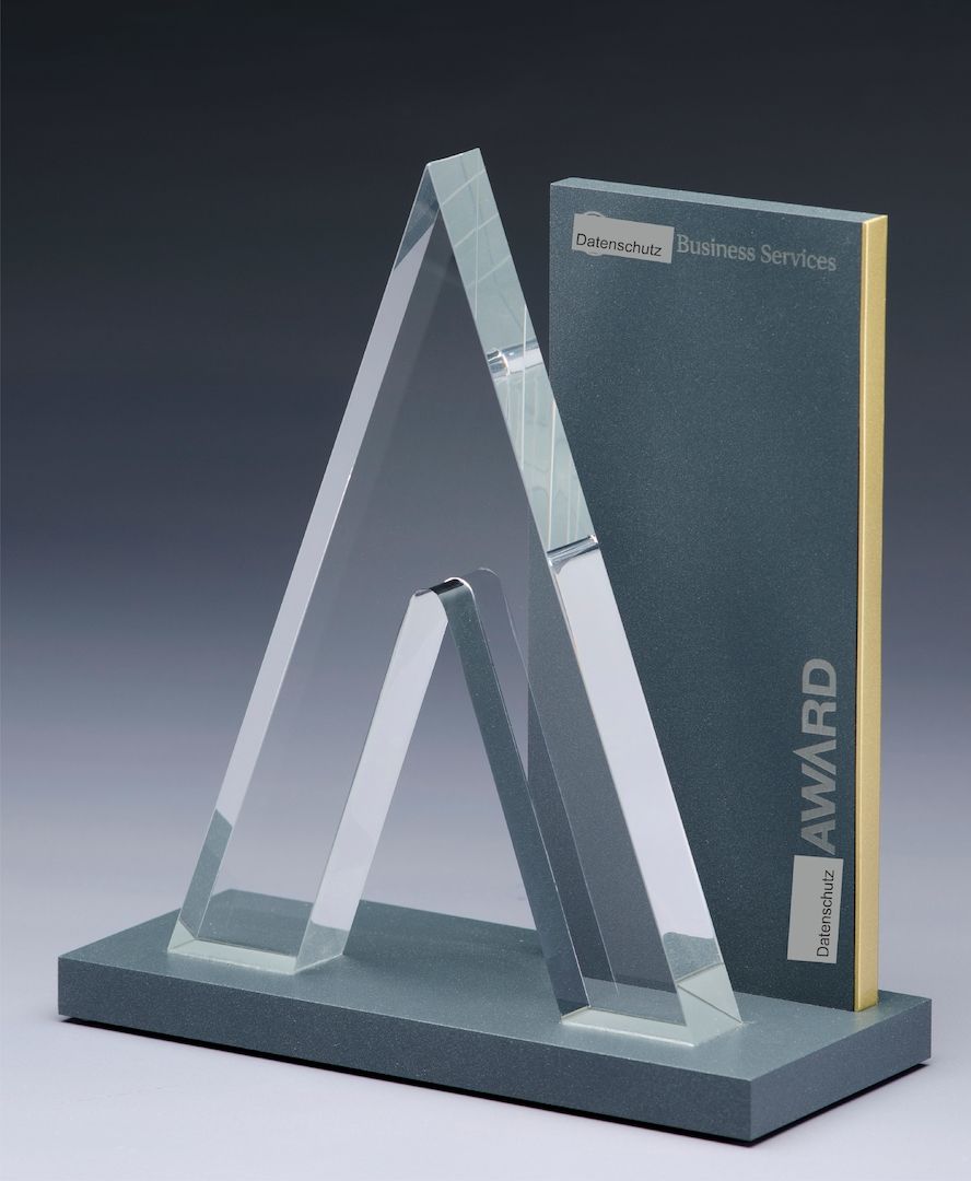 Dieser Award besticht durch seine eigenwillige und formschöne Dynamik - vor der graphitfarbenen Metallrückwand (mit seitlicher Goldapplikation und Lasergravur) hebt sich das CNC-gefräste, klare Acrylteil besonders schön ab. Diese Auszeichnung hat eine Gesamthöhe von 240mm.