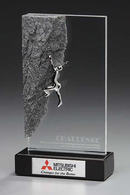 Eine Business-Auszeichnung mit einer Kombination aus einer Kristallglasscheibe, einer Metallfigur und einem schwarzem Holzsockel. Ein präzise ausgearbeiteter Gipfelstürmer-Award der ungemein motiviert.