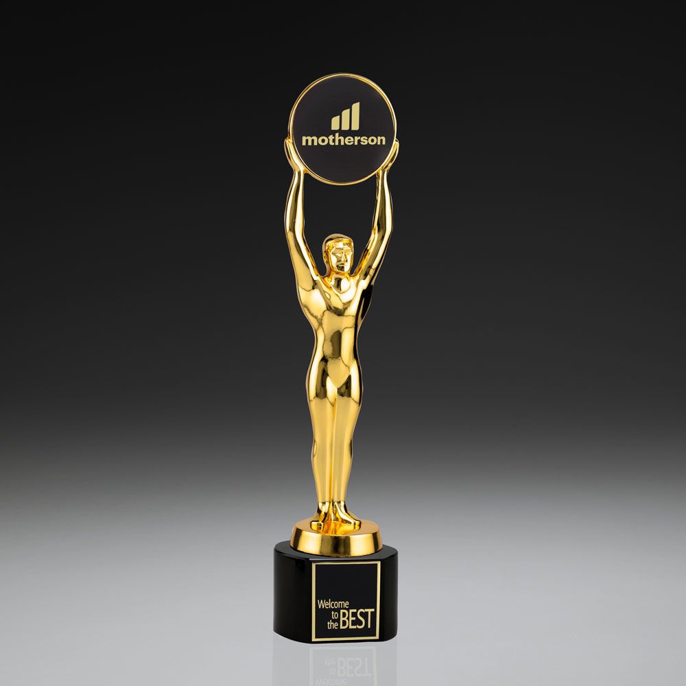 Ein imposanter Award, mit bis zu 385 mm Höhe, aus massivem Metallguß, hochglanzpoliert, goldoptik. Die Figur hält eine runde Metallplatte in die Höhe, in deren Vertiefung ein entsprechend gelasertes/bedrucktes Emblem eingelegt werden kann.