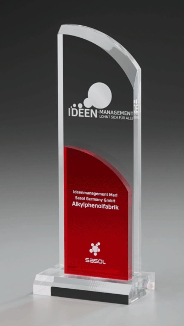 Eine ästhetische Auszeichnung mit abgerundeten Oberkanten, wobei das klare Rückteil zusätzlich noch durch die tiefe Facette besticht. Die geschmackvolle Kombination von rotem und transparentem Acrylglas wirkt nicht zu bunt, fällt aber trotzdem ins Auge.