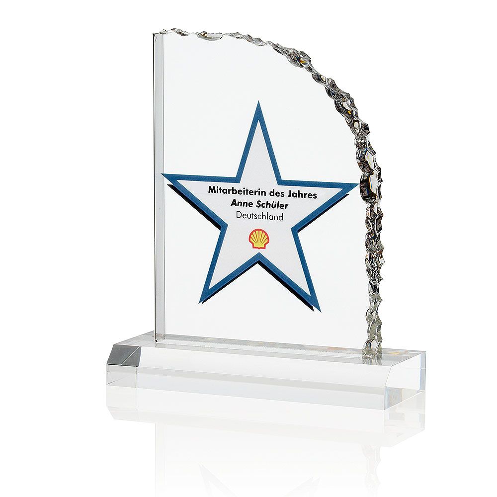 Bei diesem Award ensteht durch die kunstvolle Kantenfräsung der Eindruck entsteht, als wäre eine Ecke abgebrochen. Top trendy, mit viel Platz für die Gravur.