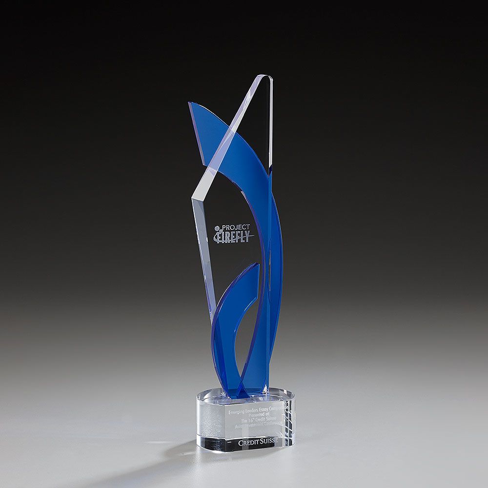 Ein formvollendetem Design: Ein klares Mittelteil, mit einem kleineren, blauen Glasbogen vorne und einer großen Schwinge auf der Rückseite. Hier kann zusätzlich der Sockel für eine lasergravur verwendet werden, da dieser an der Vorderseite extra dafür begradigt wurde. Mit einer Höhe von 305mm und dem auffälligen Formenspiel wird dieser Award zu einer repräsentativen Auszeichnung, die ins Auge fällt.