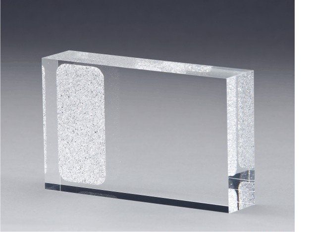 Die Kristallsplitter sind als ein an den Ecken abgerundetes Rechteck in das glasklare Acryl eingegossen. Eine Personalisierung kann wahlweise per Lasergravur oder farbigem Digitaldruck erfolgen.