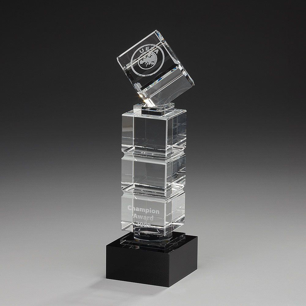 Eine raffiniert gestaltete Trophäe, mit einem Glaswürfel on top, der auf der Ecke steht. Der schwarzen Kristallglassockel ist ein passender Abschluß und verleiht dem Award zusätzlich noch das gewisse Etwas.