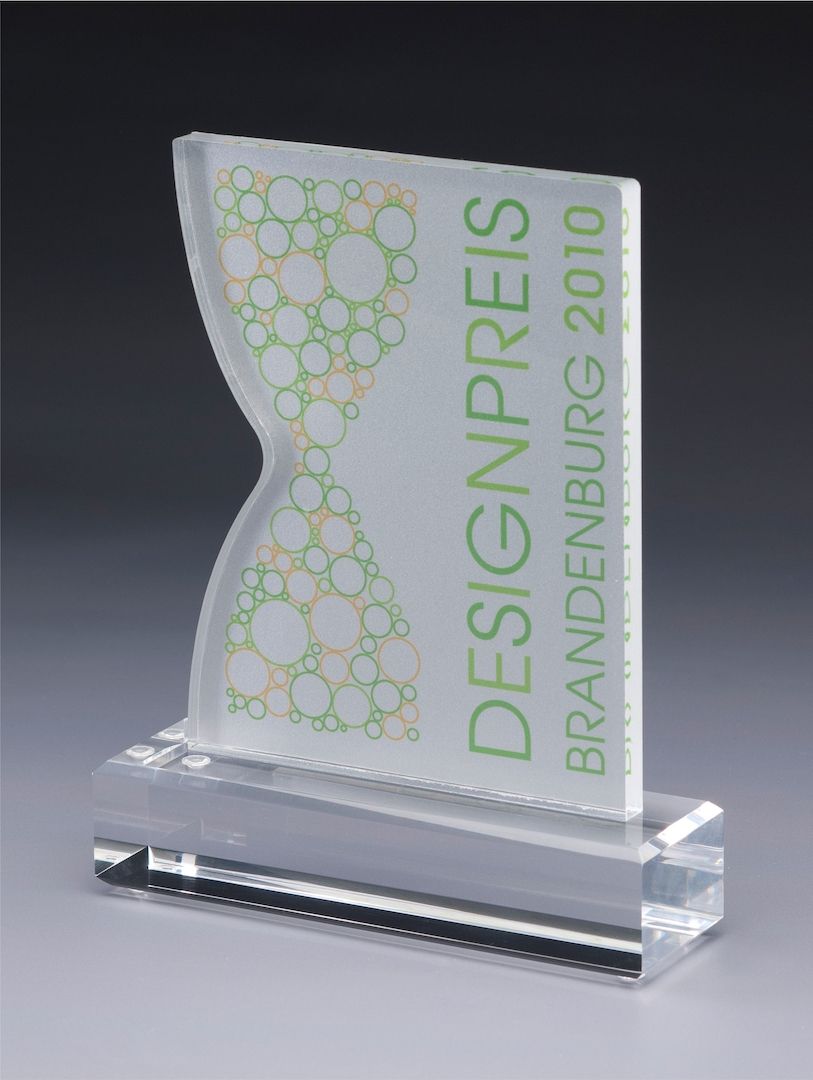 Eine Sonderanfertigung aus konturgelasertem Acrylglas und digitaler Bedruckung auf satinierter Folie - diese verleiht der Auszeichnung einen durchscheinenden Charakter und ist stimmig zu den gewählten Logofarben des Designpreises.