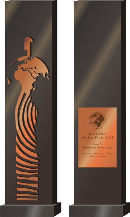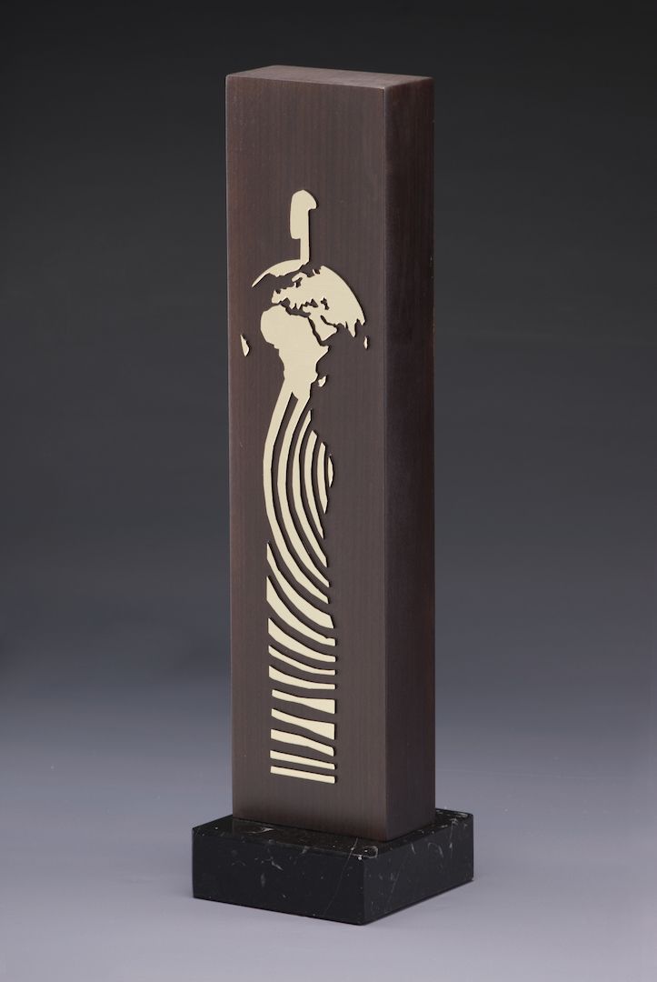 Ein Holzkorpus auf Marmorsockel, mit Metallauflage und Personalisierung auf der Rückseite. Ein Award, der Politiker, Wissenschaftler, Ökonome, Künstler und Entwicklungshelfer auszeichnet, die sich um die Entwicklung in Afrika verdient gemacht haben. Die "Deutsche Afrika Stiftung" setzt sich seit über 35 Jahren für die Förderung der deutsch-afrikanischen Beziehungen im Sinne einer friedlichen Zusammenarbeit und Völkerverständigung ein.