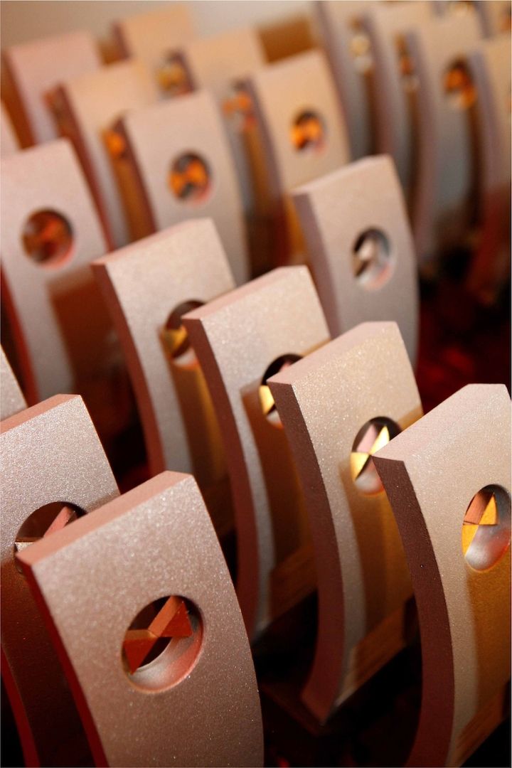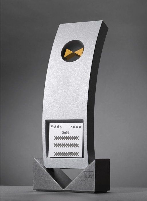 Der Award wurde im Gußverfahren hergestellt und besteht aus zwei Teilen - einem Sockel mit weichem glatten Lacküberzug, sowie einer Stafette mit rauer Oberflächenstruktur. Die scheinbar schwebenden zwei Metalldreiecke in der oberen runden Öffnung werden unterschiedlich in Gold, Silber und Bronze lackiert und spiegeln die Platzierung wieder.