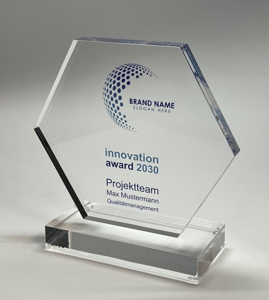 Diese nachhaltige ECO-Acryltrophäe im "Hexagon-Design" bietet viel Platz für Logos/Motive/Text und kann bedruckt und/oder gelasert werden.