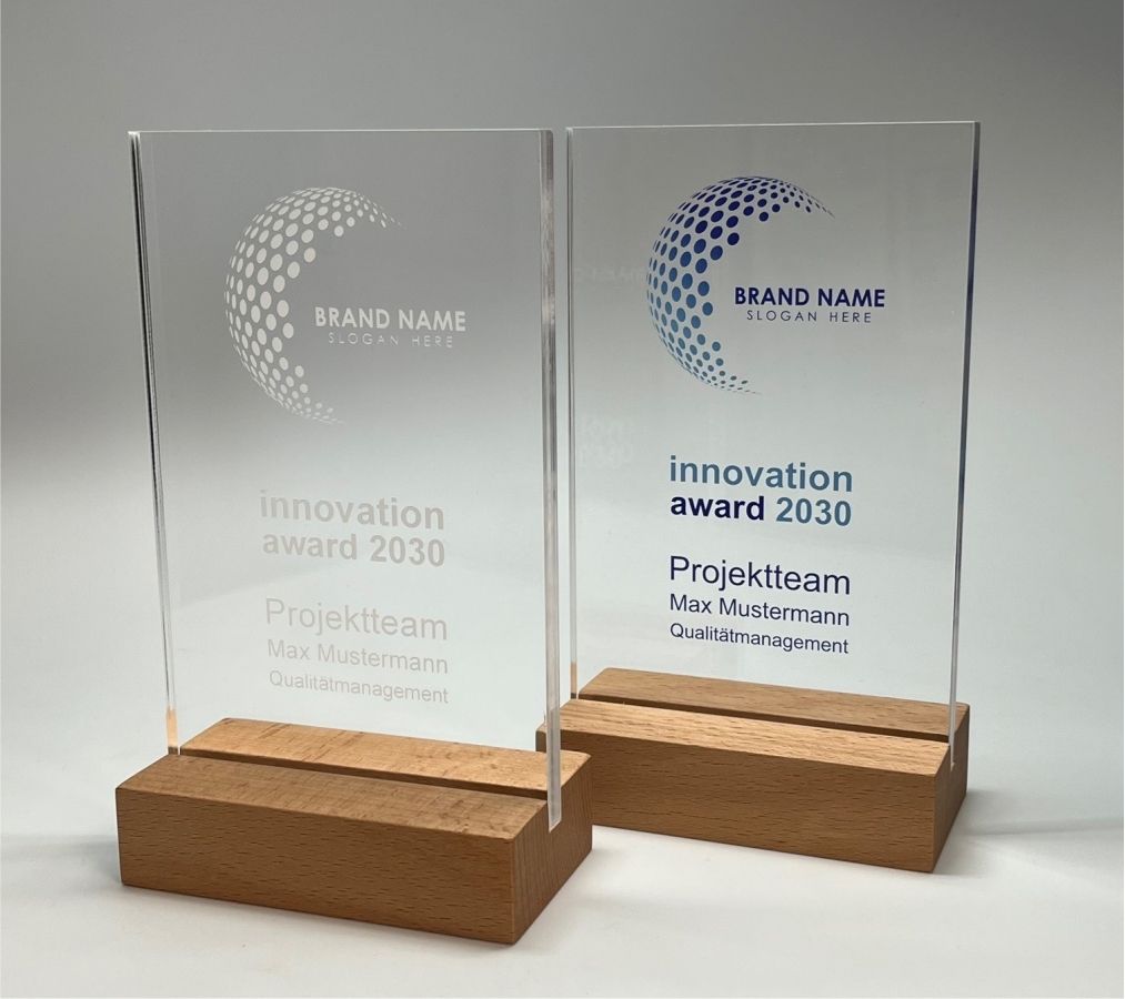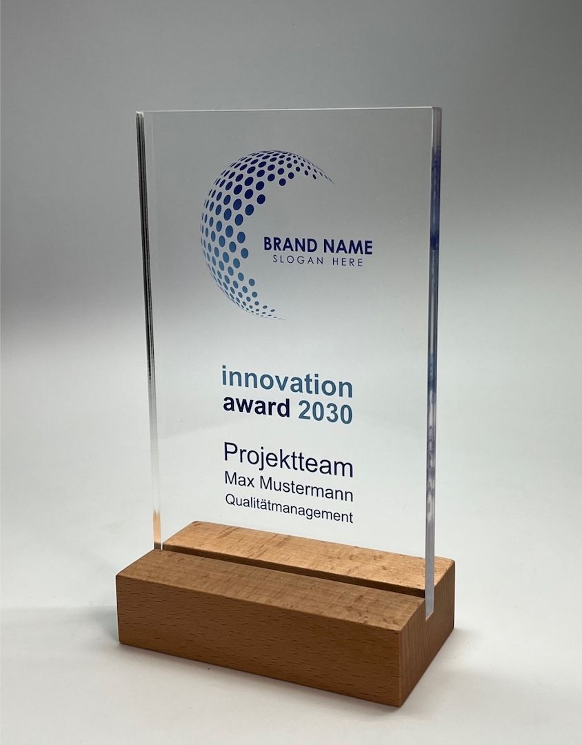 Trophäe aus recyceltem Acrylglas + nachhaltigem Holzsockel