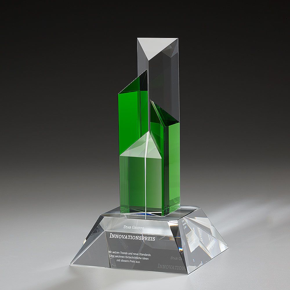 Eine High-End-Trophäe, die mit 300mm und einem massiven Glassockel ein paar Kilos auf die Waage bringt. Die vier unterschiedlich hohen Glassäulen bilden ein Ganzes und könnten sinnbildlich als "Treppe nach oben" oder als Balkendiagramm stehen. Dieser Award beindruckt durch seine klaren Linien und sein opulentes Erscheinungsbild.