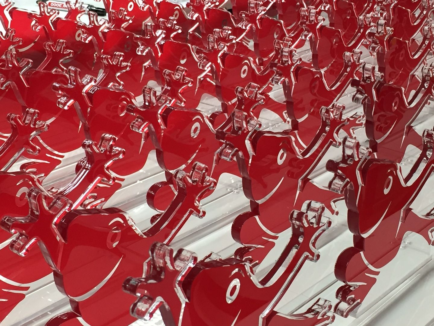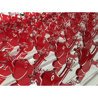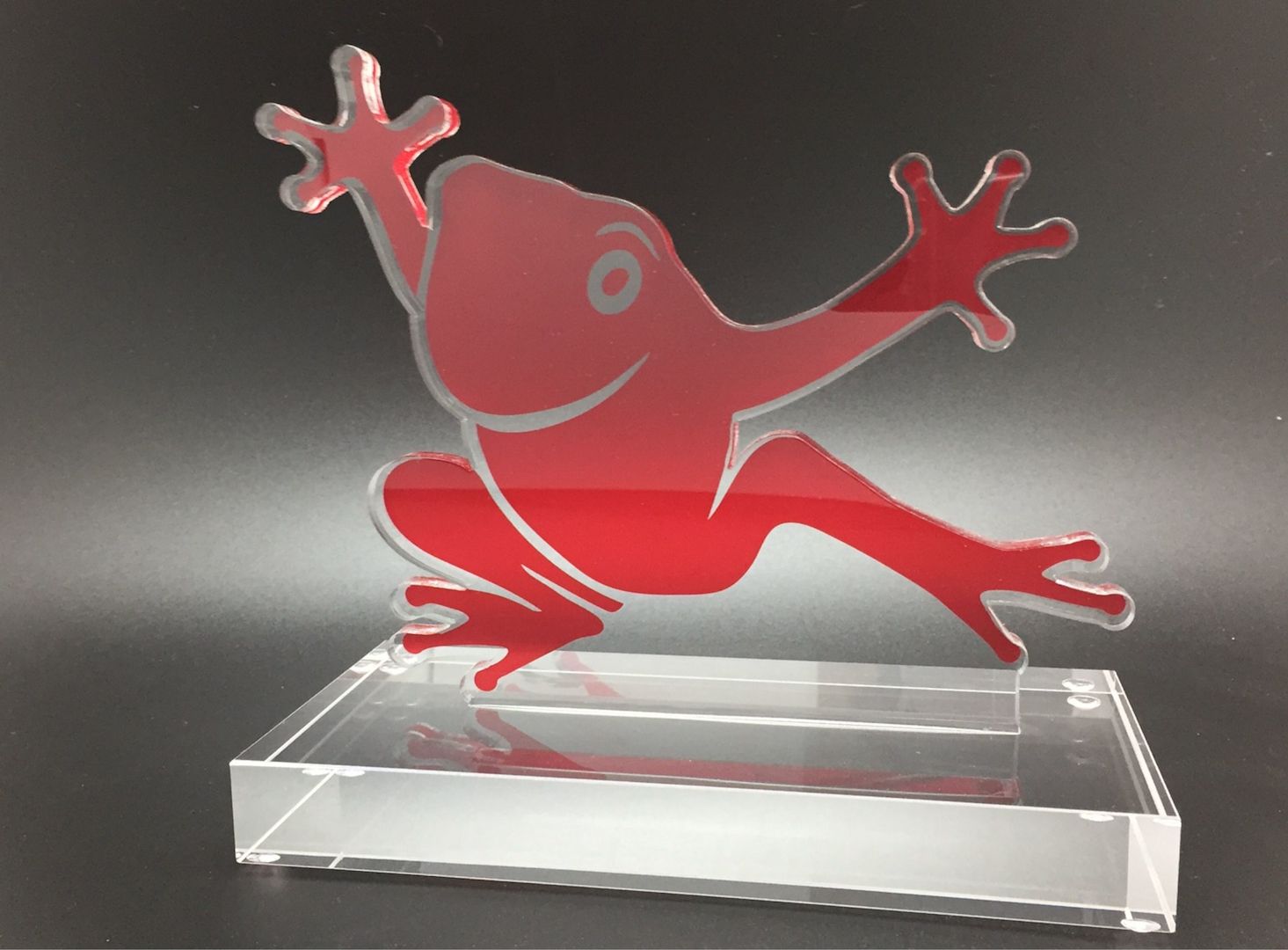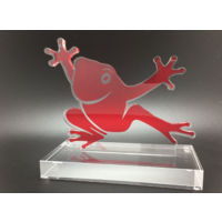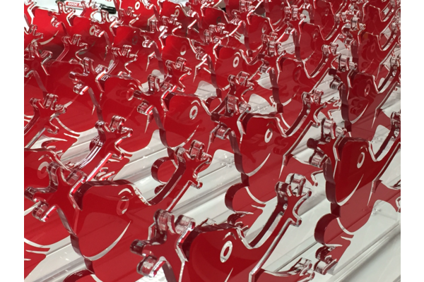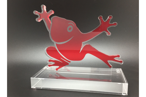 Dieses Unternehmenslogo eignet sich besonders gut für Laserkonturschnitt + vollflächigen digitalen Farbdruck - die 10mm starken Oberteile der Trophäen werden per UV-Verklebung auf Acryl-Sockel geklebt und personalisiert. Eine wunderbare Auszeichnung, die Energie und Gute Laune transportiert.