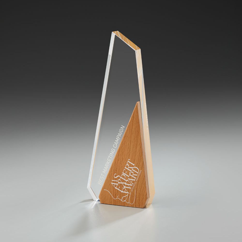 Ein stilvoller, unkonventioneller Award, dessen 20mm Materialstärke durch eine 5mm Holzapplikation verstärkt wird. Die freie Glasform, sowie das Holzpendant eignen sich was die Beschriftung betrifft eher für Akzente - hier ist weniger mehr.