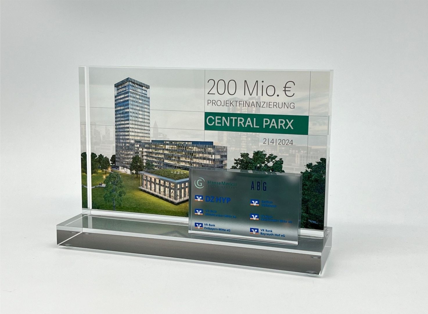 Repräsentativer Transaktions-Award mit vollflächigem, fotorealistischem Farbdruck auf dem Rückteil, sowie Logoprint auf der vorderen Stele.
