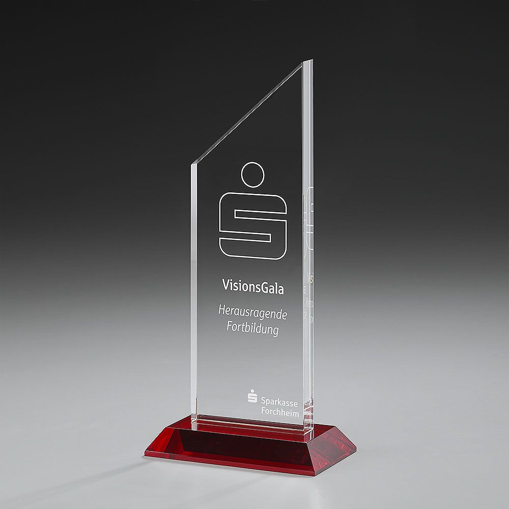 Weil es einfach unsere Top-Seller-Form ist, hier der "Fire Base Award" in der typischen "Peak(Spitze)-Variante" - diesmal als Glasaward mit rotem Sockel. Die Trophäe kann mit der Spitze nach links oder nach rechts aufgestellt werden, da die breiten Facetten des Sockels gleichmäßig umlaufend sind. Zu dem Style des Awards passt gut eine dezente Lasergravur, aber natürlich auch ein Farbdruck.