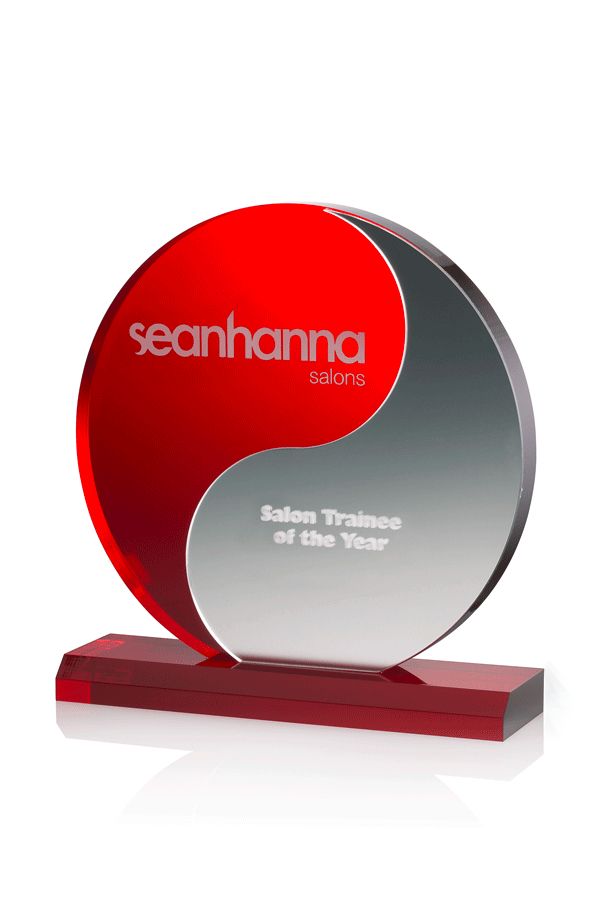 Eine Trophäe, die das Thema des "Yin und Yangs" spiegelt, also symbolisch für Gegensätze und Gleichgewicht steht. Die gefrostete-silberfarbene Gravurfläche ist direkt auf dem roten Grundkörper angebracht. Dieser Award ist auch in blauem Acrylglas, als "Yin and Yang Trophy, Artikelnummer 7313" erhältlich.