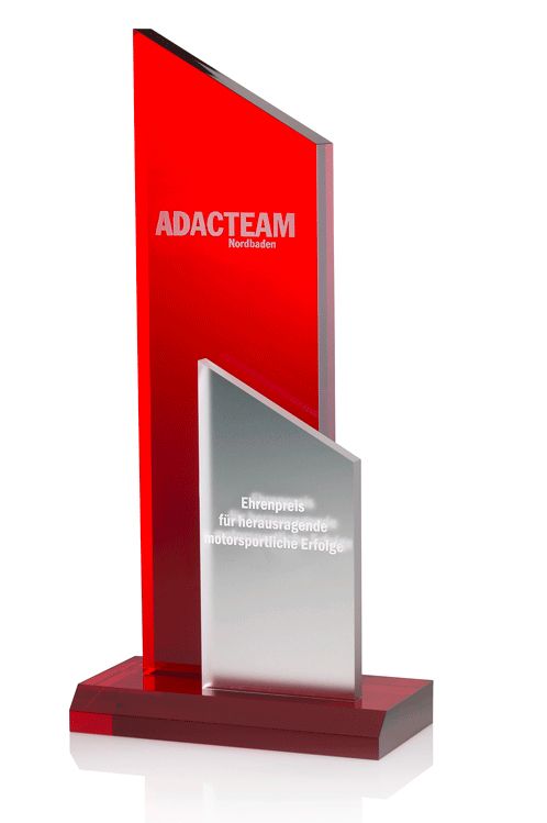 Ein rotes und ein "gefrostetes", silberfarbenes Rechteck, hintereinander gestellt und oben abgeschrägt - eine klar strukturierte Trophäe, die häufig vergeben wird.