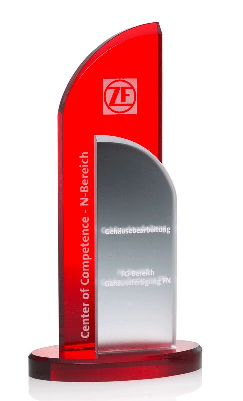Ein ansprechendes Award-Design, bei welchem sich, durch die versetzt angeordneten Oberteile, eine vertikale Gravur auf dem rotem Acrylglasflügel anbietet.