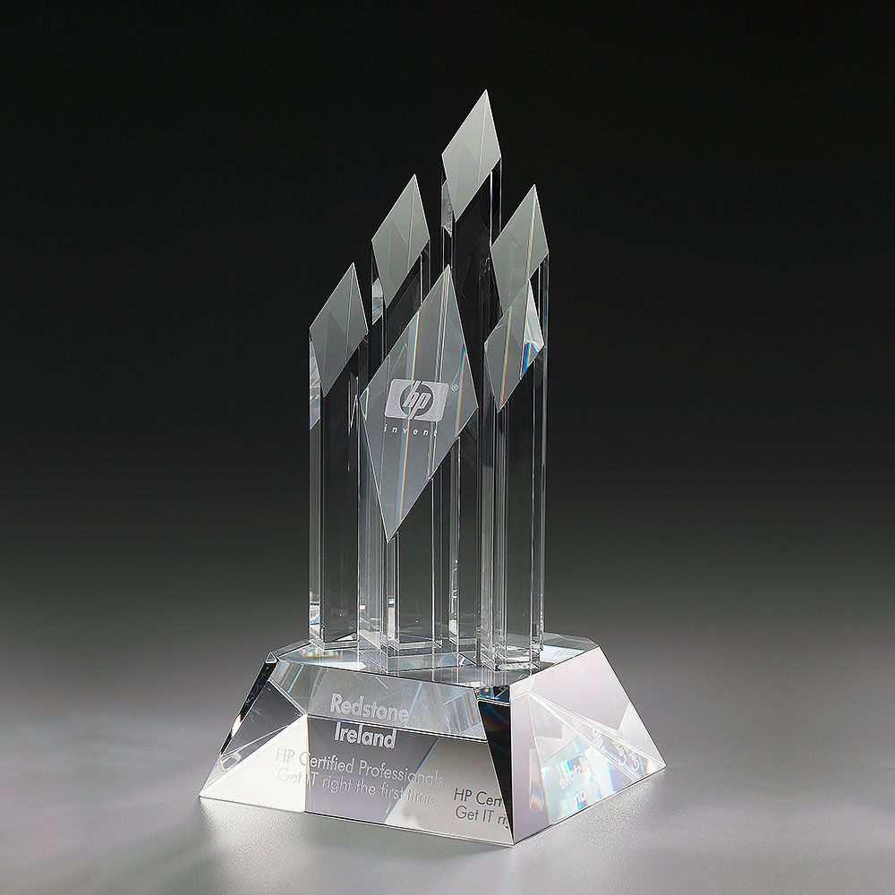 Eine High-End Auszeichnung, welche aufgrund ihrer aufwendigen Verarbeitung, ihrer Gesamthöhe von 300mm und einem Gewicht von mehreren Kilos höchsten Ansprüchen entspricht. Auf dem 60mm hohen Kristallglassockel umrahmen fünf 20mm starke Außensäulen, eine Mittelsäule. Die Lasergravur erfolgt auf der Mittelsäule, oder dem Sockel. Vorsicht: Die Spitzen dieses Awards sind scharf!
