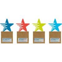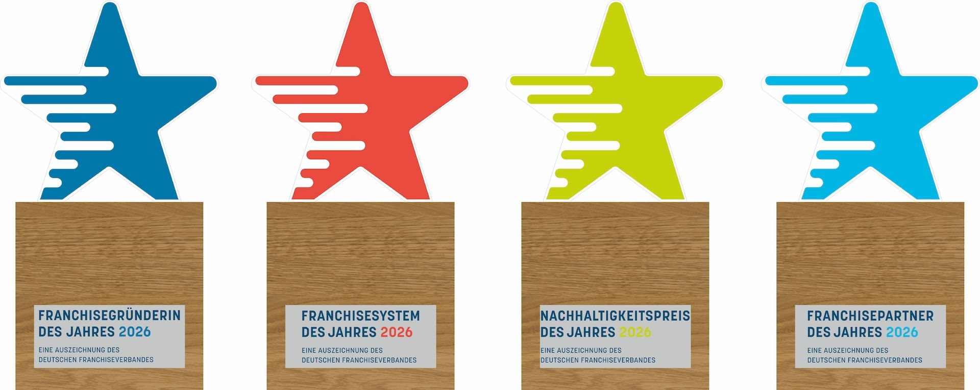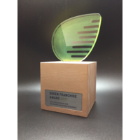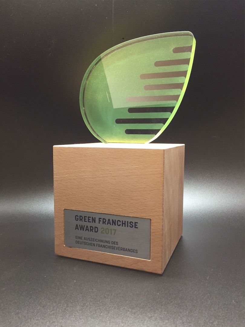 Die "Franchise Awards" werden aktuell in "Sternform" für 4 Kategorien vergeben, die sich jeweilig in der Farbgebung, sowie der Personalisierung unterscheiden: Franchisegründerin / Franchisesystem / Nachhaltigkeitspreis / Franchisepartner. Eine wunderschöne, extravagante Trophäe, mit einem transluzent bedruckten Oberteil auf einem 150x150x150mm Eichenholzkubus aus nachhaltiger, heimischer Forstwirtschaft.