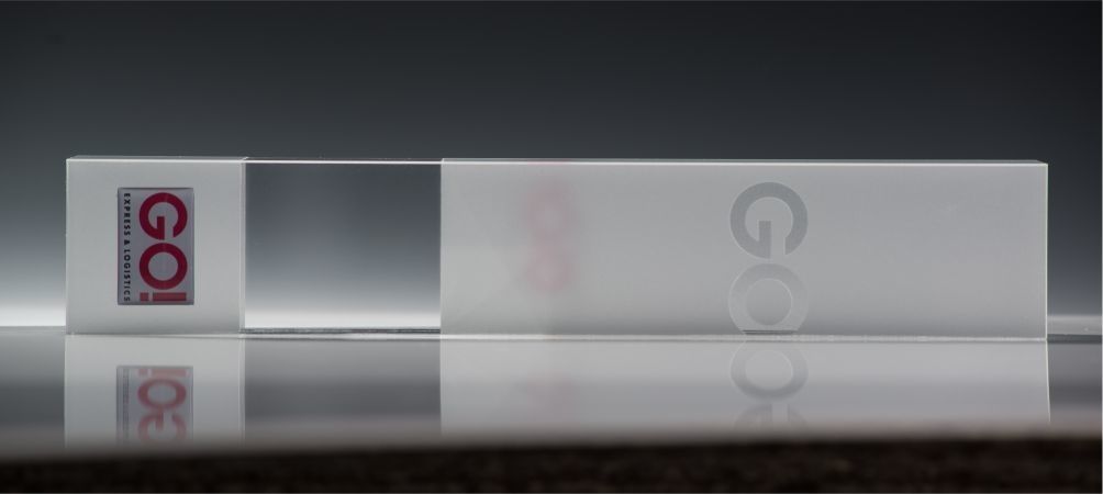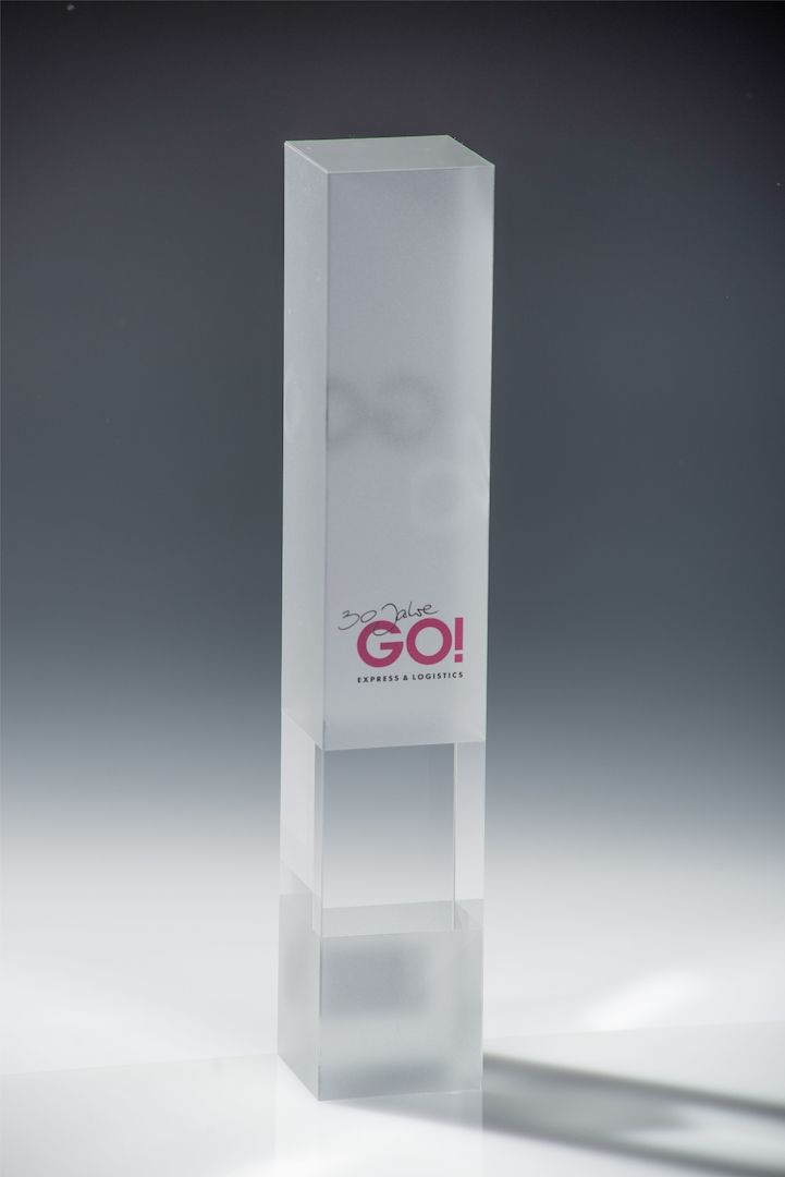 Diese Auszeichnungen stellen das Ausrufezeichen hinter dem "Go!"-Logo dar. Sie sind oben und unten mit Sandstrahleffektfolie bezogen, aus welcher das GO-Logo ausgeschnitten wurde. Anfänglich war im unteren Part noch ein Doming-Aufkleber angebracht, dann sollte eher ein ganz schlichtes, klassisches Erscheinungsbild überzeugen und 2014 wurde die Stele aufgrund eines Firmenjubiläums mit einem dezenten Farbdruck versehen.