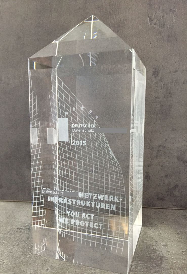 Diese Auszeichnung wird jährlich an energieeffizient oder ressourcenschonend arbeitenden Rechenzentrumsbetriebe verliehen. Der 3D-File stellt eine 3D-Gitternetzliniengrafik dar, die sich in dem Glasquader räumlich wölbt, dazu kommt ein Logo, sowie ein Titelthema.