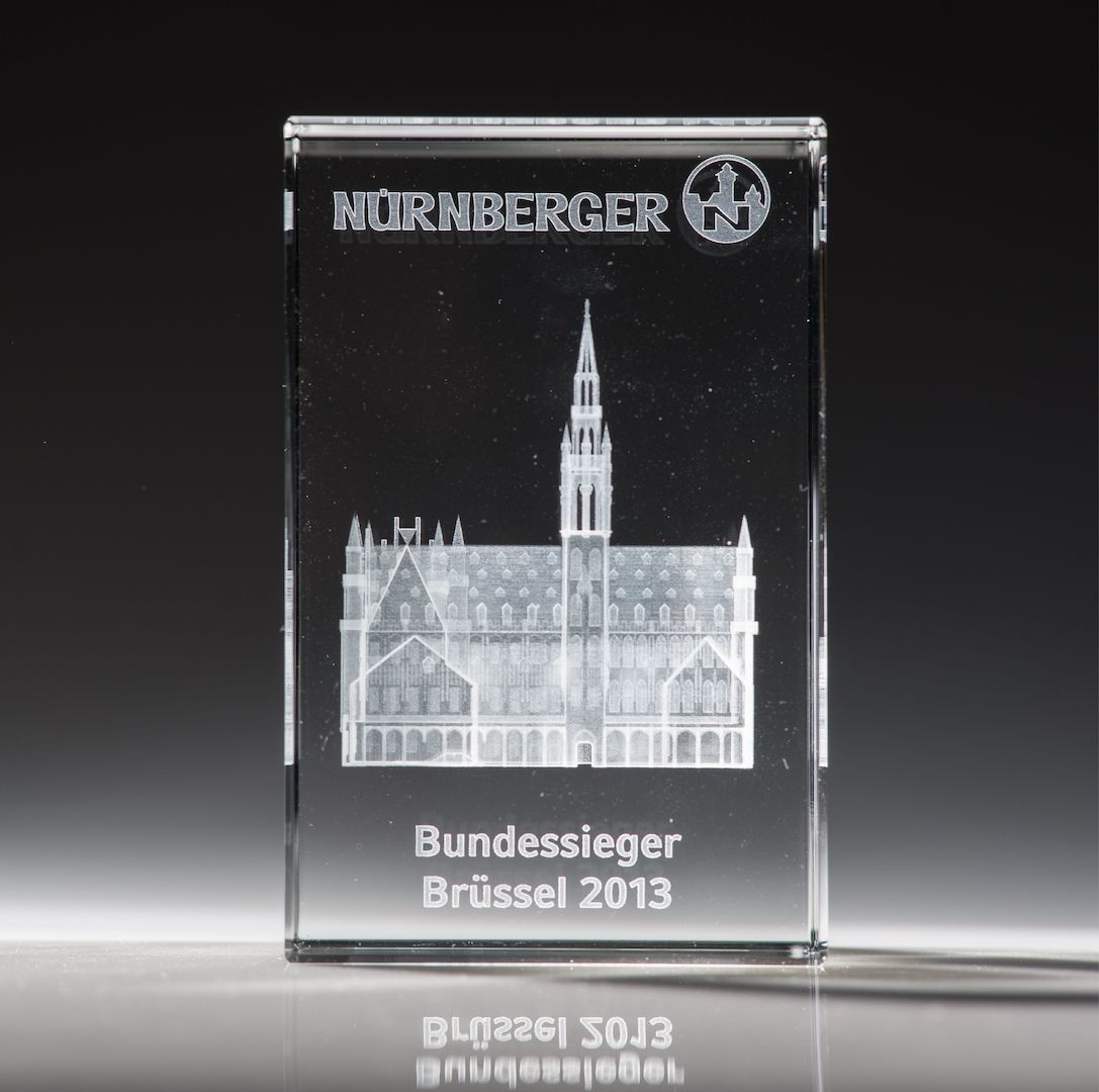 Glasquader mit 3D-Laserinnengravur "Rathaus - Brüssel"