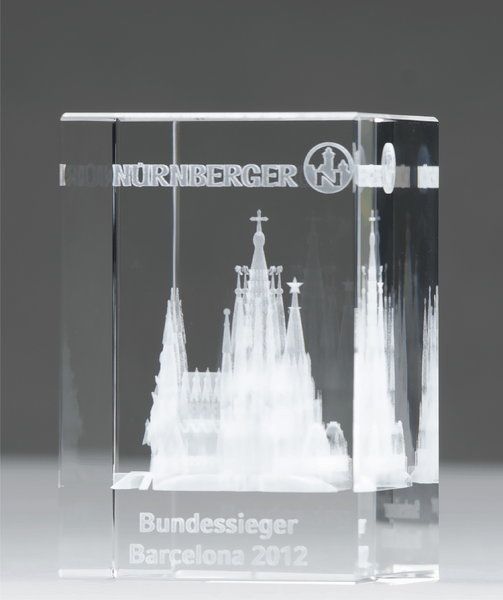 Der 3D-File dieses Glas-Pokals umfasst als Motiv die "Sagrada Familia", sowie das Unternehmenslogo und Text. Wer dieses außergewönliche Bauwerk kennt, weiß, welche Herausforderungen hier eine detailgetreue Nachbildung ist.