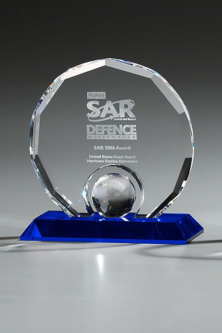 Dieser runde Glaspokal besticht mit aufwendigem Facettenschliff und einem tiefblauen Glassockel. Die freistehende Weltkugel wird von dem Oberteil durch eine kreisrunde Aussparung umrahmt. Für diesen Award können Sie auch statt einer Weltkugel, eine Glaskugel mit Golfball/-, Tennisball/-, oder Fußballrelief wählen. Abbildungen hierzu können wir Ihnen gerne zukommen lassen.