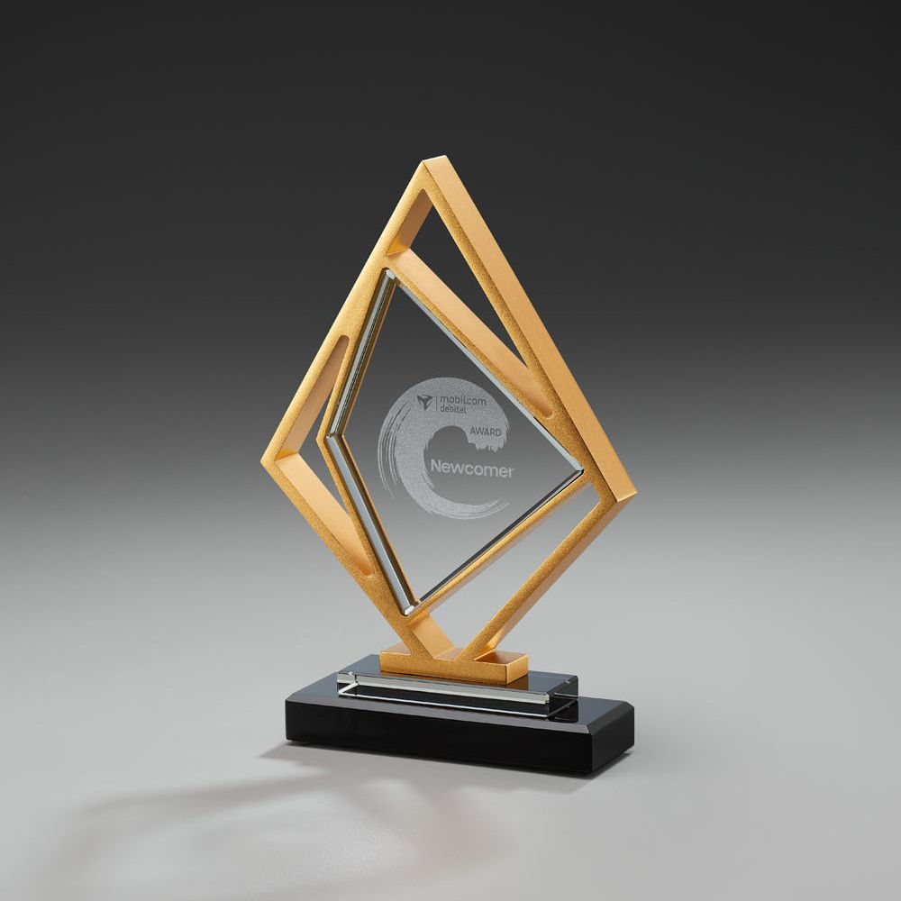 Extravaganter, formschöner Award mit einem aufwendig verarbeitetem, gold eloxiertem Metallrahmen, welcher mittig eine Glasscheibe hält. Die Sockellösung aus einem schwarzen und einem transparenten Part verleiht dem Award bei aller Exklusivität, ein leicht verspieltes Design.