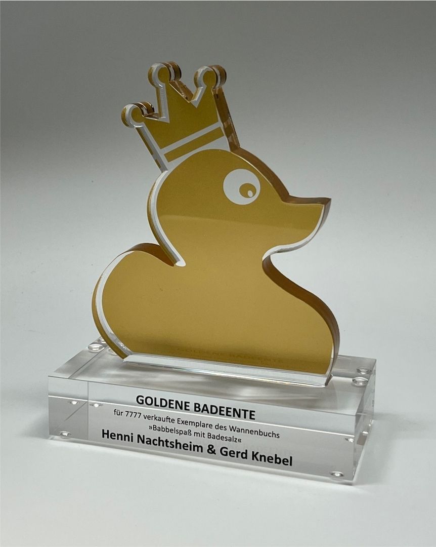 Och joh. Goldene Schallplatte? Kann doch jeder. Goldene Kamera? Langweilig. Für das Kult-Comedy-Duo Badesalz aus Hessen gab es am Wochenende die „Goldene Badeente“. In Erfurt in der Alten Oper haben Henni Nachtsheim und Gerd Knebel den erstmals verliehenen Preis der Edition Wannenbuch entgegengenommen. Und die Trophäe gleich in ihr aktuelles Programm „Kaksi Dudes“ auf der Bühne eingebaut. Dafür gab es begeisterten Applaus des Publikums – und zwei sichtlich erfreute Künstler. „Der Preis bekommt einen Ehrenplatz“, versprachen sie. Die Edition Wannenbuch aus Chemnitz hat das Duo aus Hessen für den Erfolg ihres Buchs „Babbelspaß mit Badesalz“ ausgezeichnet. 7777 Exemplare wurden davon verkauft – ein Ende ist nicht abzusehen. Die mittlerweile vierte Auflage des wasserfesten Büchleins ist damit fast vergriffen. „Oscars, Grammies oder Emmis hat ja jeder … aber eine Goldene Badeente?“, kommentierten die Künstler nach der Preisverleihung stolz auf ihrer Website.