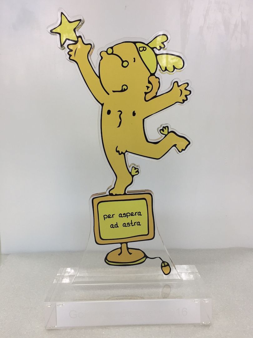Eine witzige, auffällige und hintergründige Auszeichnung und der einzige bereichsübergreifende Social Media-Preis Deutschlands: Konturgeschnitten, vollflächig bedruckt, mit Lasergravur auf dem Sockel. Aus mehreren 1000 Einreichungen wird eine Shortlist für 18 Kategorien erstellt (z.B. "Bester Medien-Blogg", "Bester Politik-Blog"...etc).
